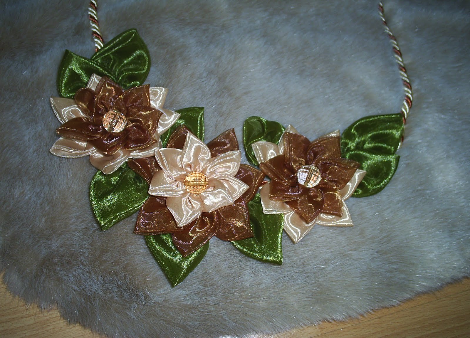 Kumaşı imitasyon kürk. Çiçekler organze tülden yapılıyor.