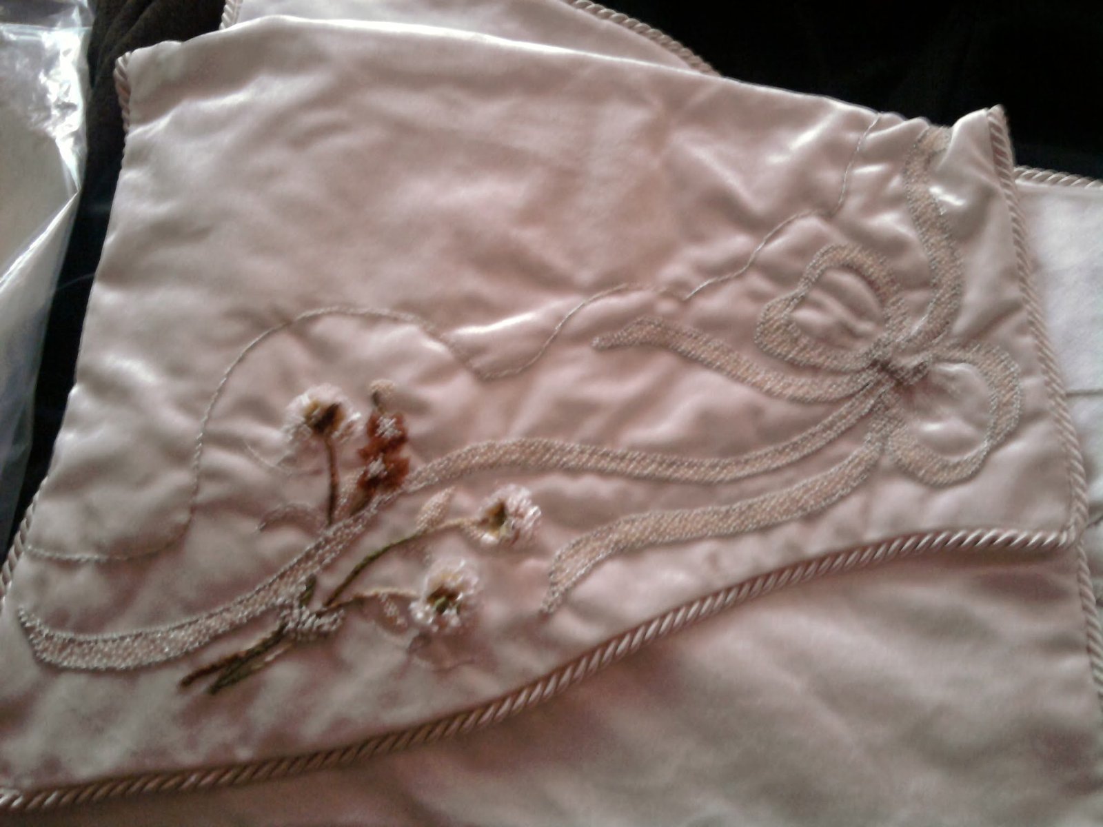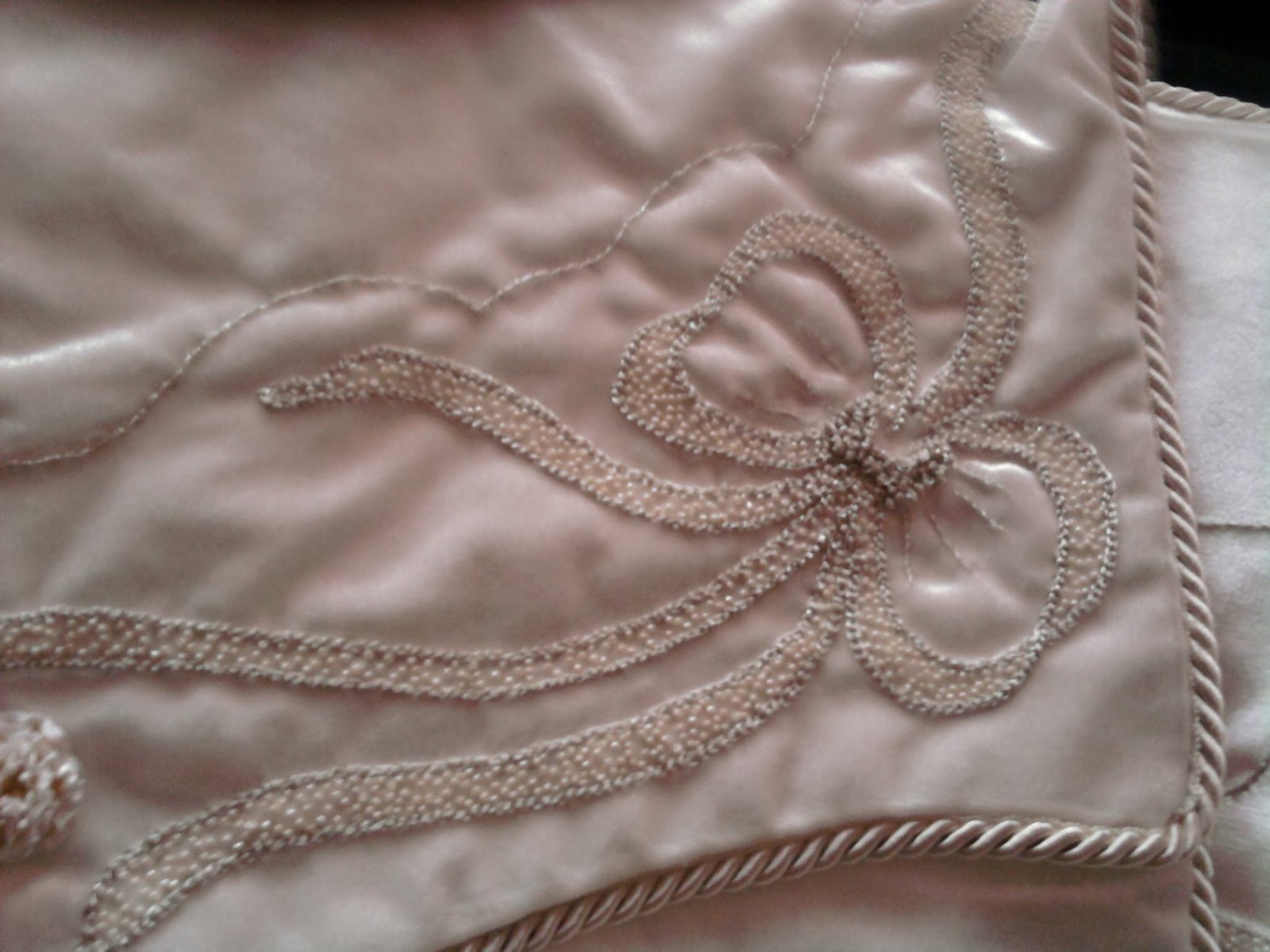 Pastel renkler kullanarak hazırlanan bu seccade, şase takımı, örneği zor olmasın ama kendisi çok güzel olsun diyenler için. Kadife kumaş üzerine kumaşın renginde boncuklarla çalışıldı. Fiyonklar ve karanfiller bir biri ile uyumlu olarak seccadeyi ve şaseyi süslüyor. Fotoğrafların kalitesi maalesef biraz düşük kalmış, kurstan bir arkadaşımın yaptığı bu harika takım yakından çok daha güzel duruyor.
