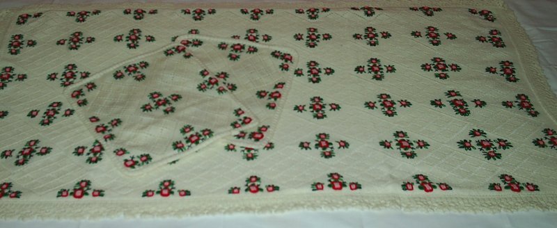 Oğlum için yaptığım brezilya nakışı örgü yatak örtüsü. Yatak örtüsünü ince yünden annem örmüş üzerini rokoko güllerle işlemiştim 🙂