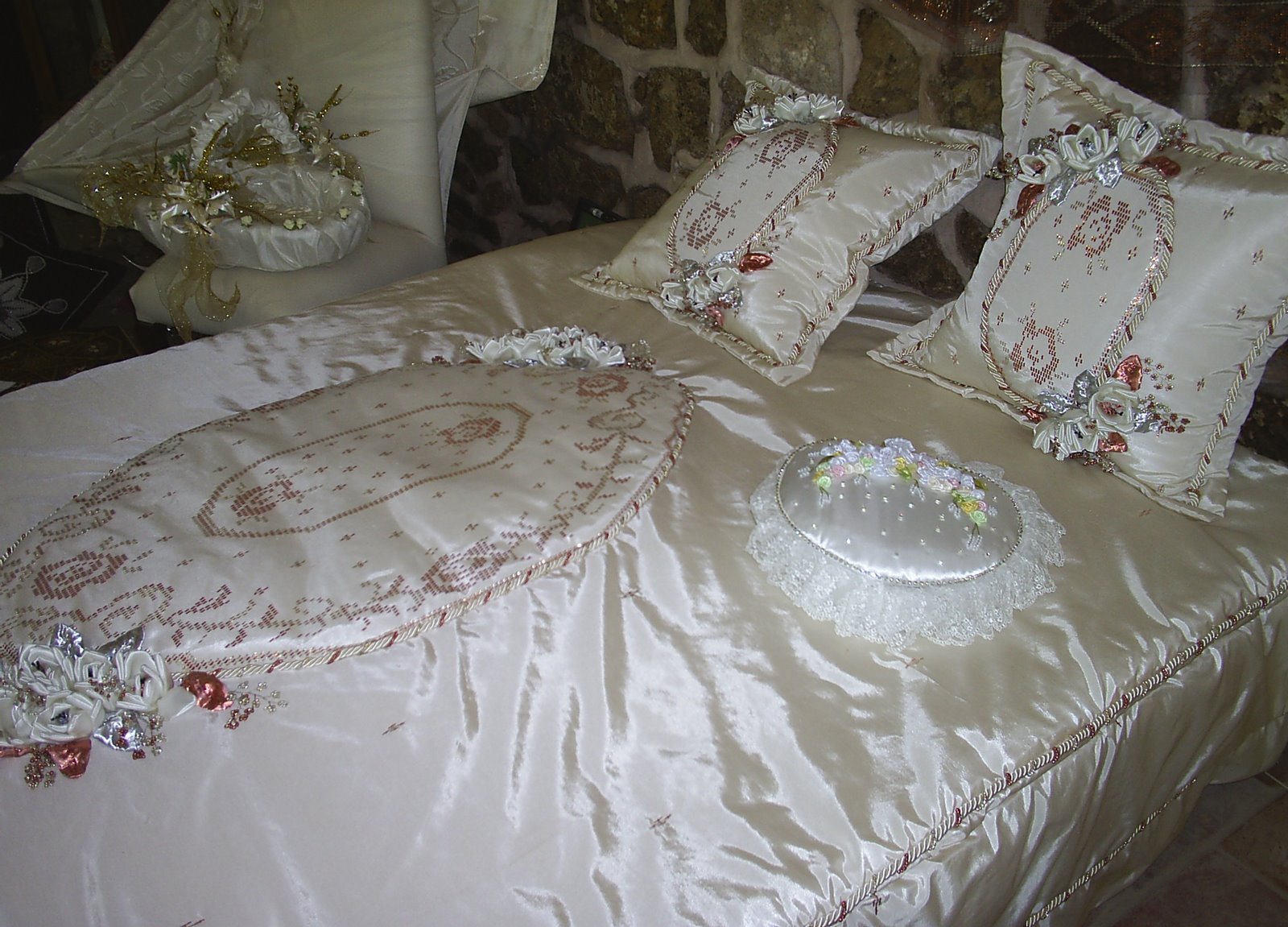 Balibey Han’da devam eden busmek sergisinden harika bir yatak örtüsü. Tel kırma olan yatak örtüsü görenleri hayran bırakıyor. kurdele nakışı teknikleri ile zenginleştirilmiş yatak örtüsünün ana nakışı telkırma.