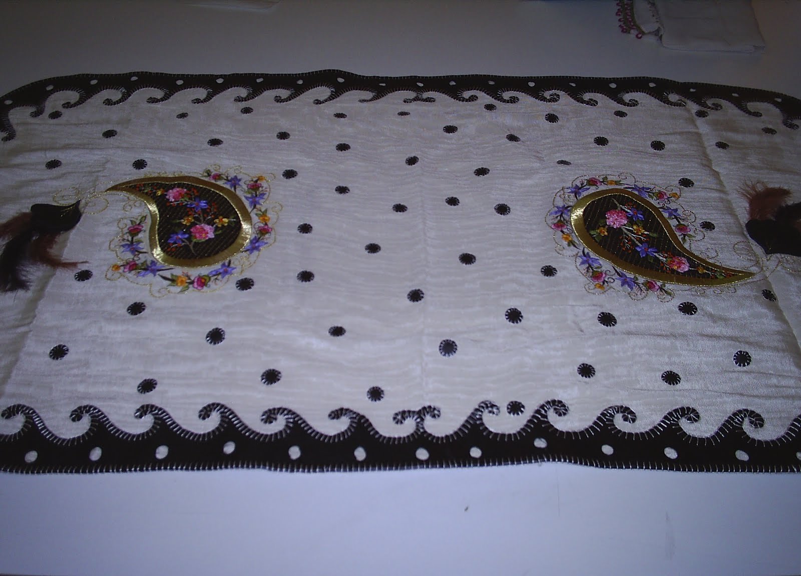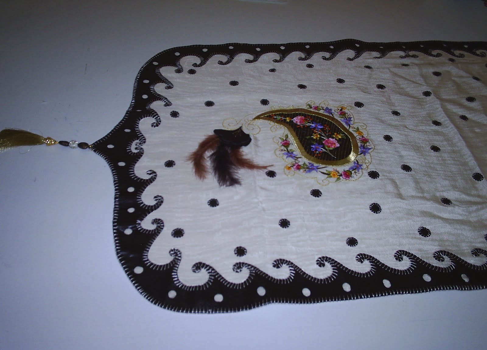 Bu harika ranır makina nakışı çiçekler ve elde deri işlemelerle süslendi.