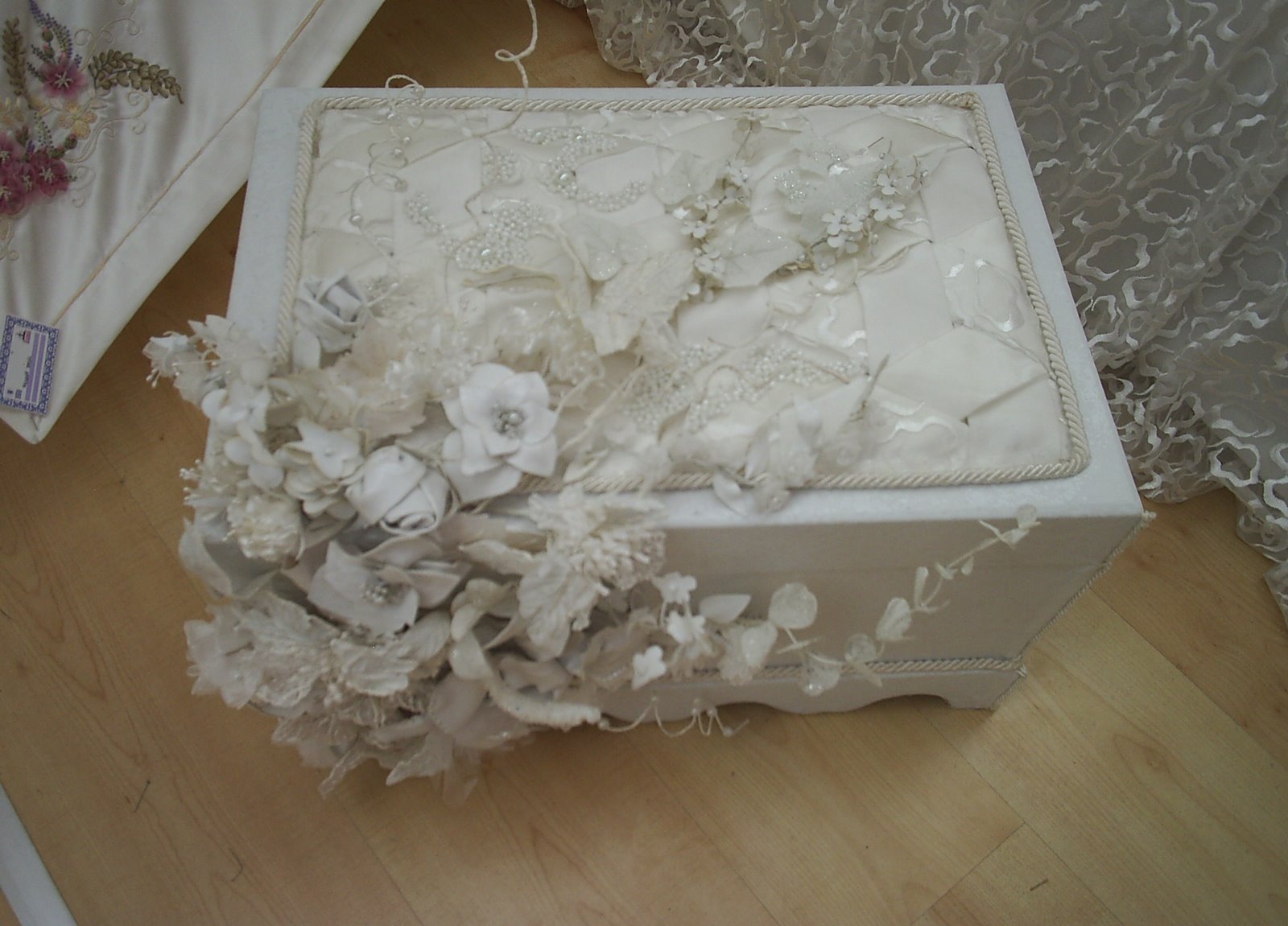 Kurs arkadaşlarımdan Havva hanım’ın Sevgi hocamızın nezaretinde büyük bir sabır ve şevkle yaptığı adeta bir gelinliği andıran yatak örtüsü. Bütün arkadaşlar meraklı sorularla her gün bu nasıl birşey olacak diyerek sıkıştırdığımız halde “ben kafamda tasarladım gözümde canlandırdım sizde bitince görürsünüz” deyip oya gibi işlediği yatak örtüsünün ayrıntıları. Yapay çiçeklerden kendisinin deriden yaptığı çiçeklere, tüllere, organzelere, bir çok detaydan oluşan harika bir yatak örtüsü. Ayrıca yatak örtüsüne deri kaplanıp güllerle süslenmiş bir sandık yine deri kaplanmış bir ayna ve abajur eşlik ediyor.