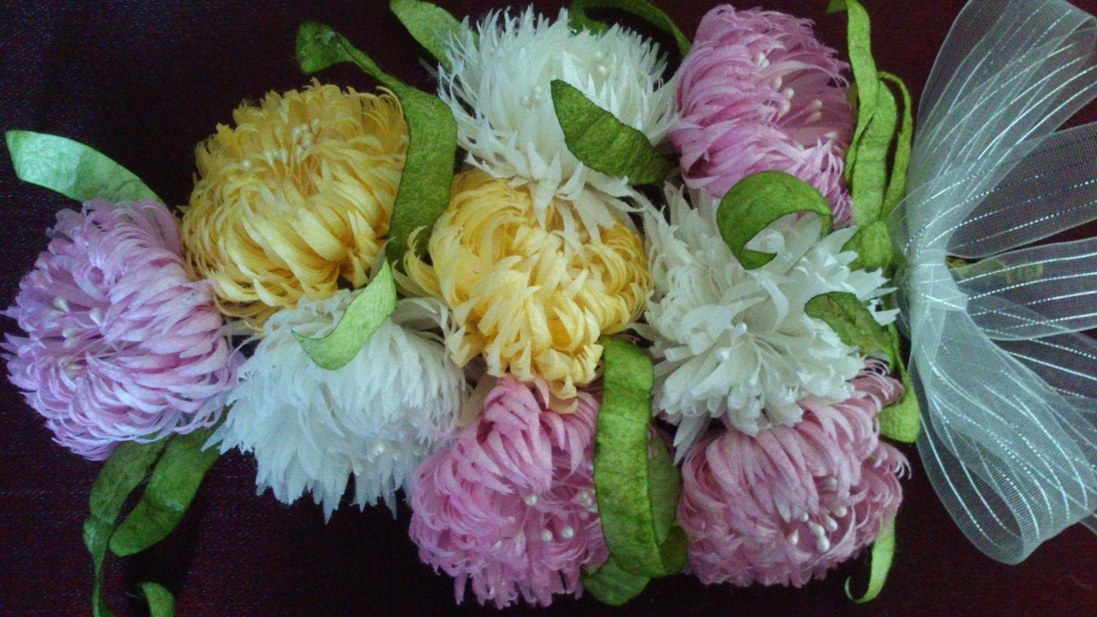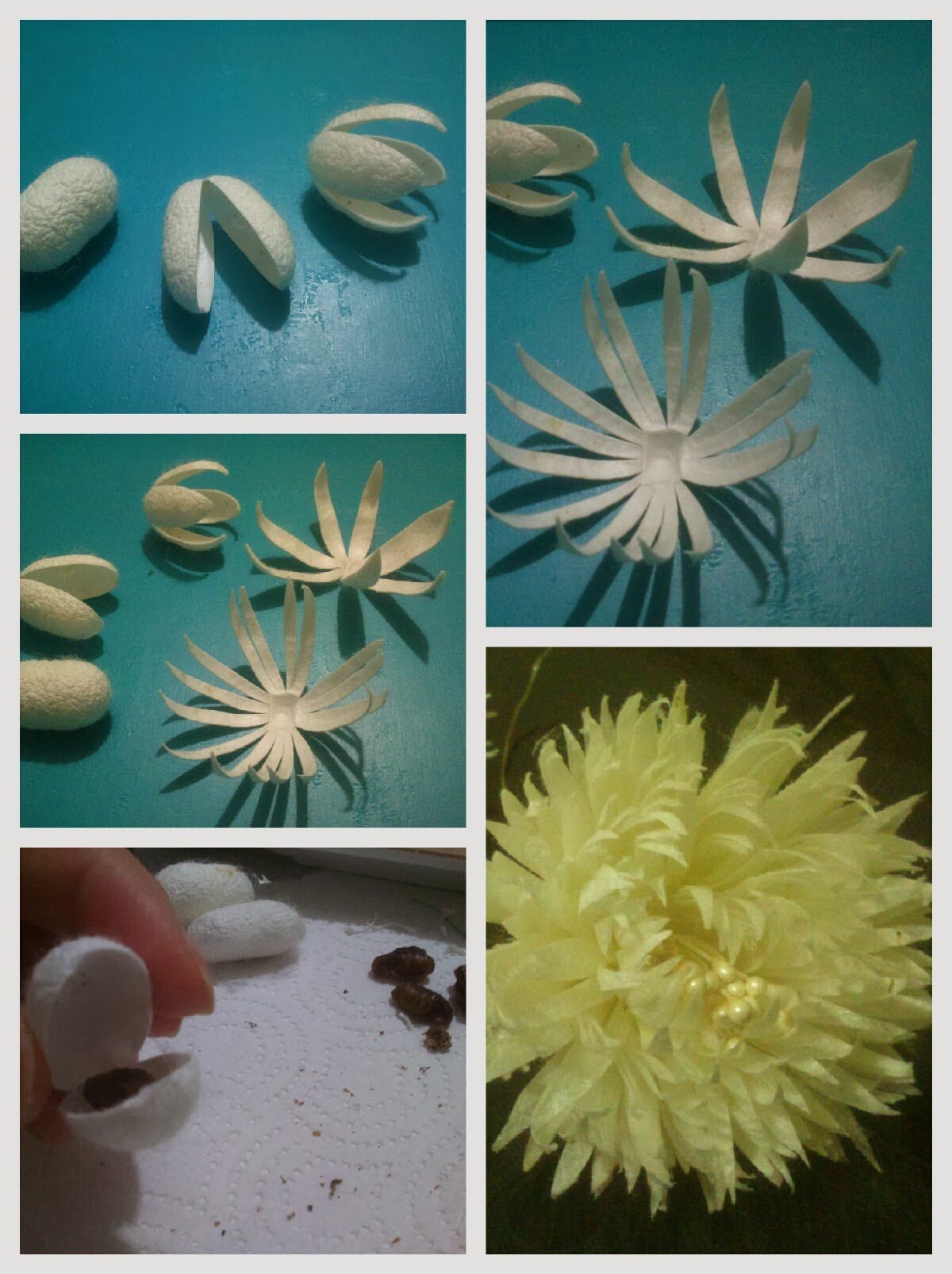 İpek kozası çalışması diye başladık ve İpek kozasından papatya yapımı ile devam ettik. Şimdi daha farklı bir çiçeğin, kasımpatının yapımı ile devam ediyoruz.