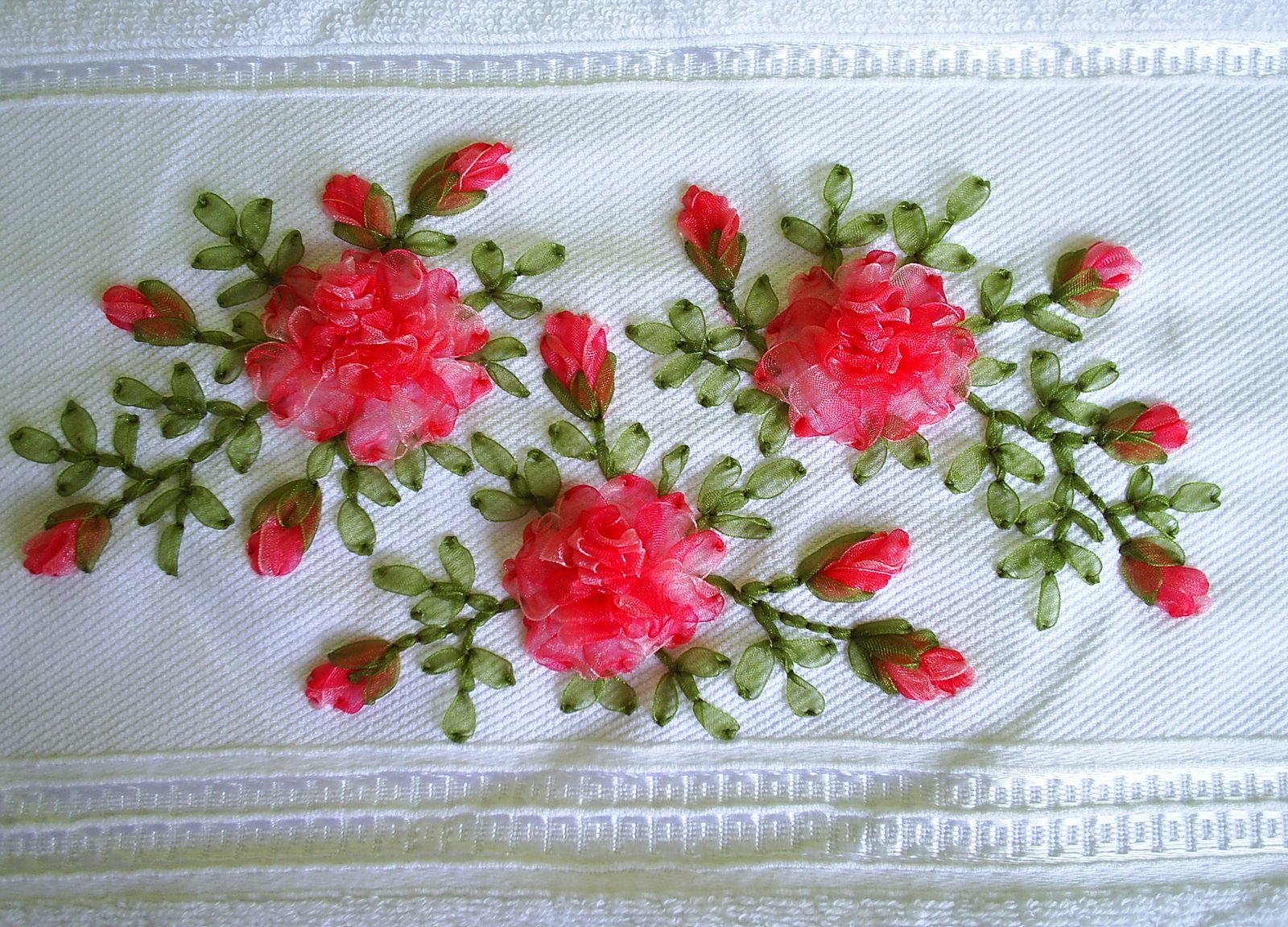Kırmızı güllerle süslenmiş bir havlu örneği. Acemilik zamanımda ebruli organze kurdeleyle yapmıştım:) İpek kurdeleyle çok daha güzel oluyor. Fotoğraf altta.