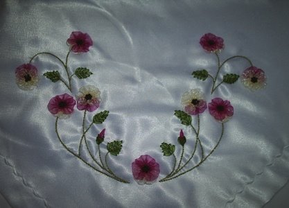 Organze kurdeleden yapılmış havlu ve bohça. Aynı örneği ipek kurdeleden de yapmıştım ama organzenin hercaide daha güzel ve canlı durduğunu düşünüyorum.