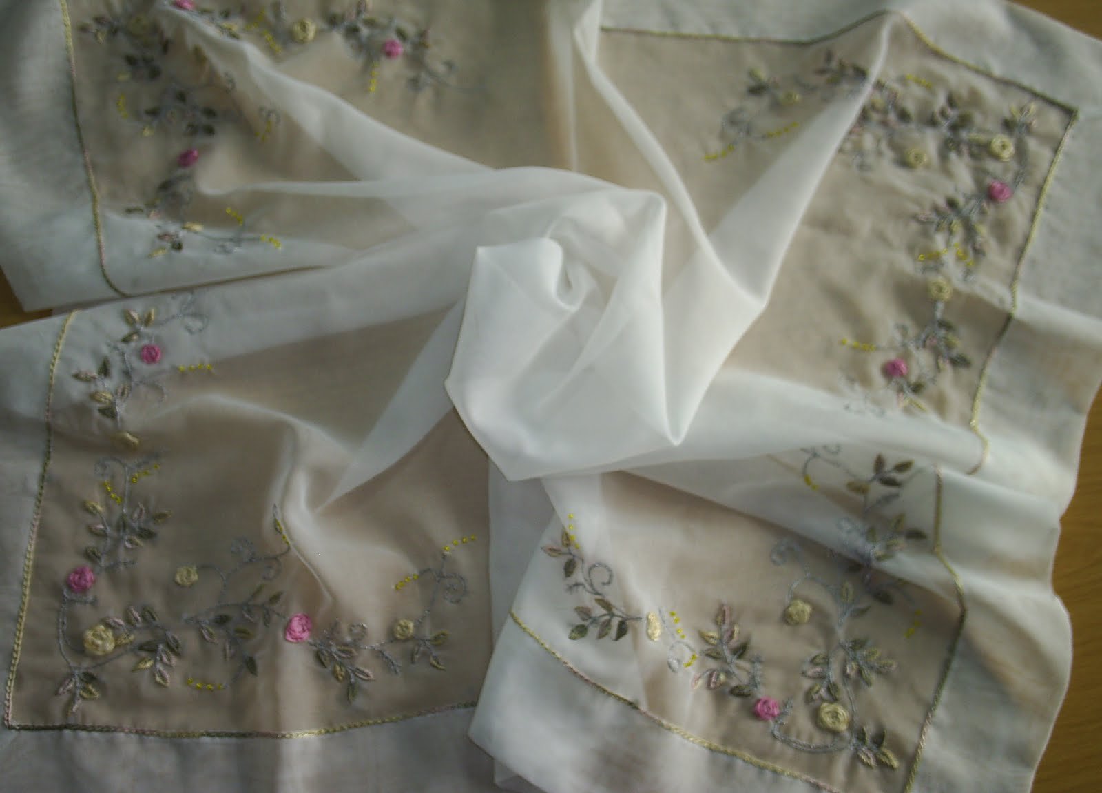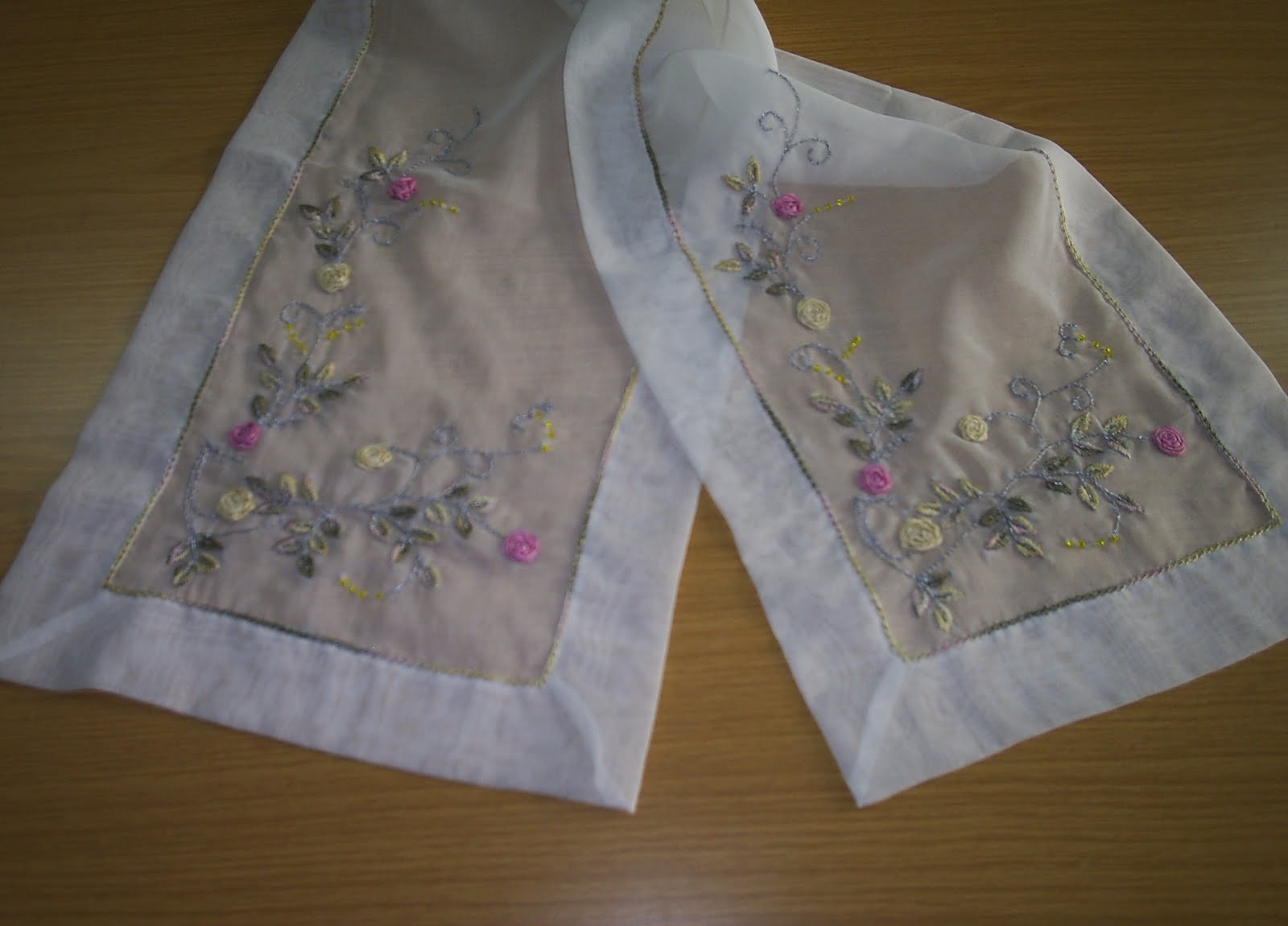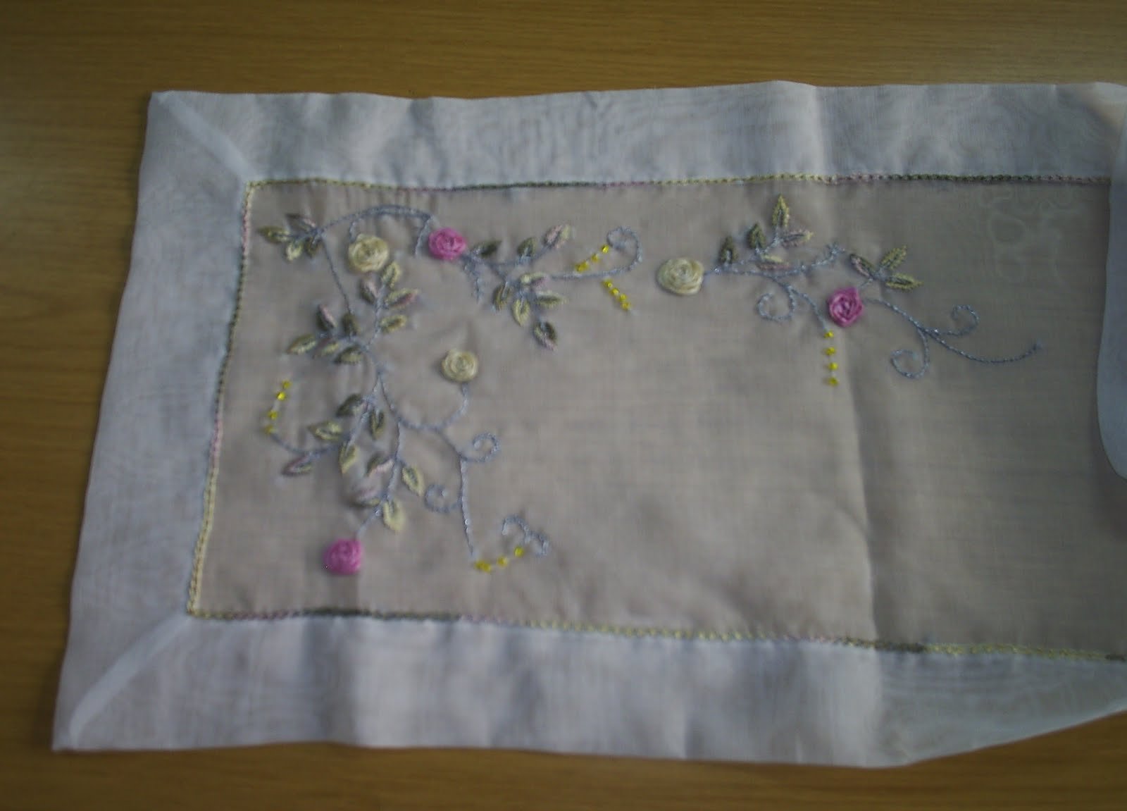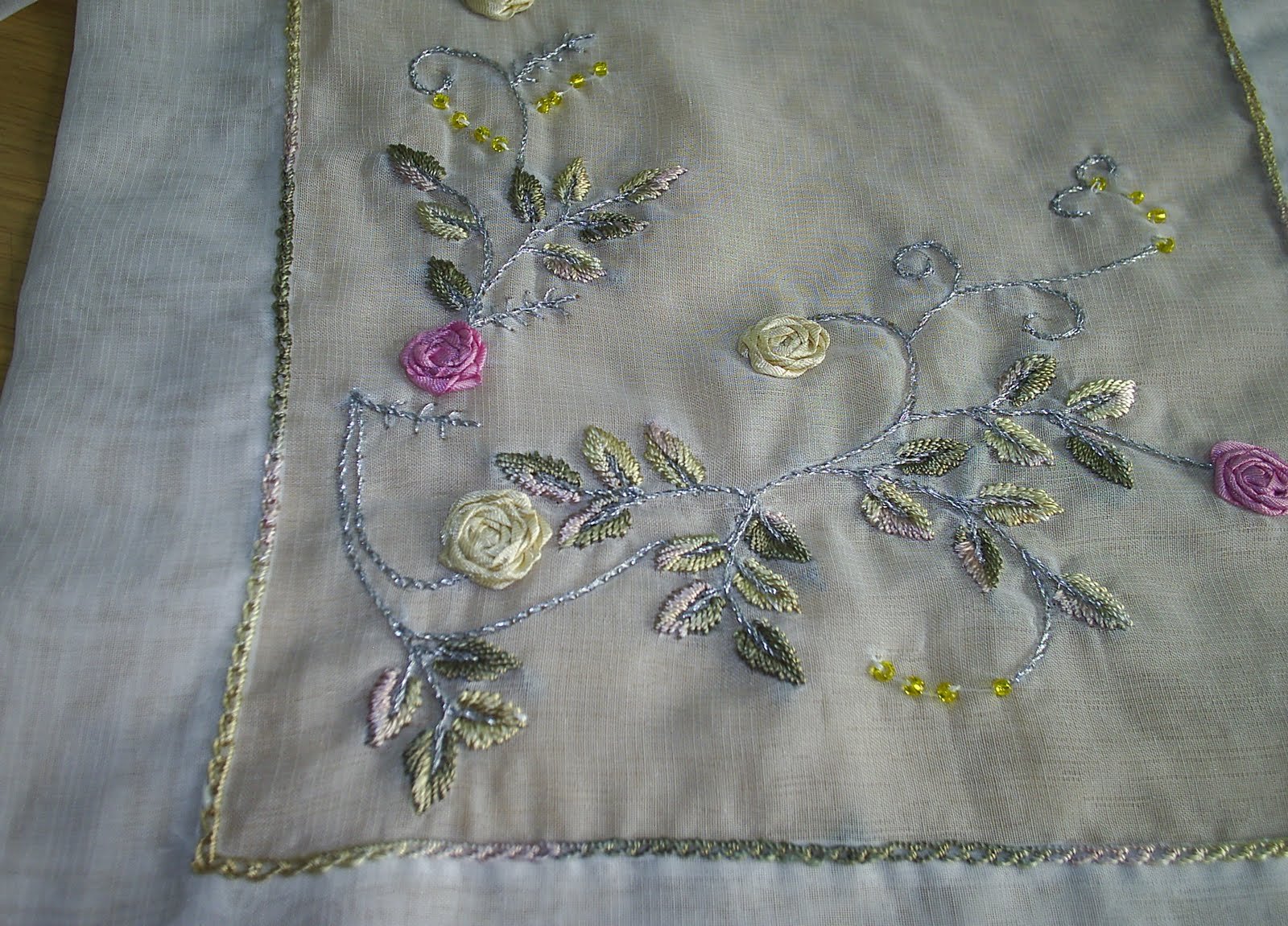 Organze kumaş üzerine ipek kurdele ile çalışılmış pastel renklerin hakim olduğu salon takımı.Kenarları zincir işi ile kapatıldı. Bu harika salon takımı yine Semra ablacığıma ait.Güzel kızları için yaptığı bu zarif işleri blogumda sergilememe izin verdiği için kendisine ayrıca teşekkür ediyorum 🙂