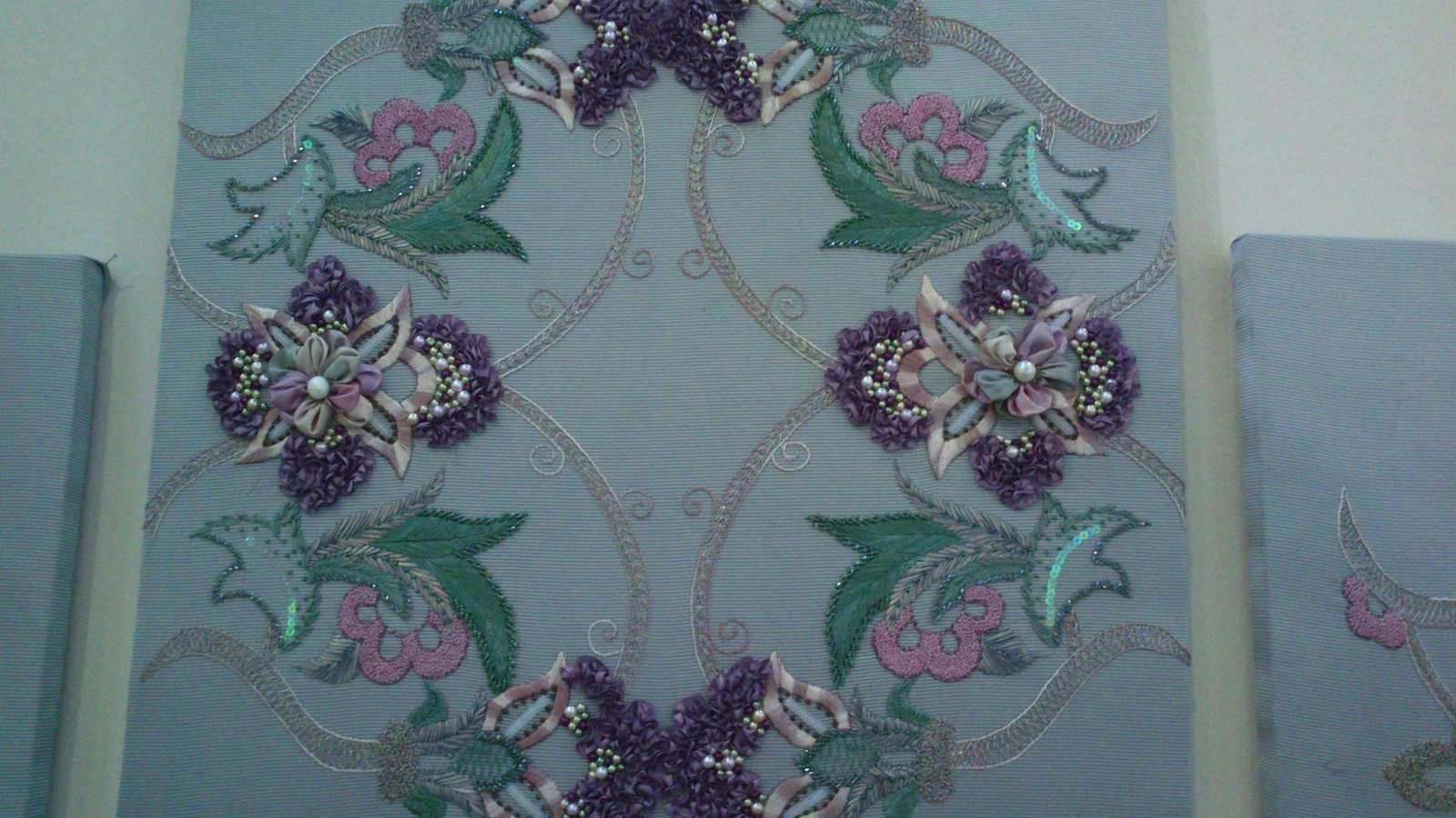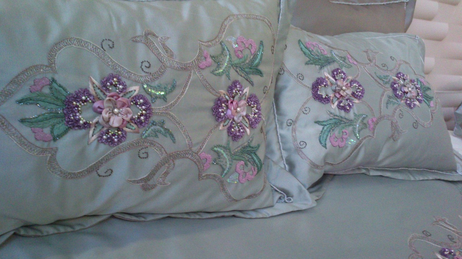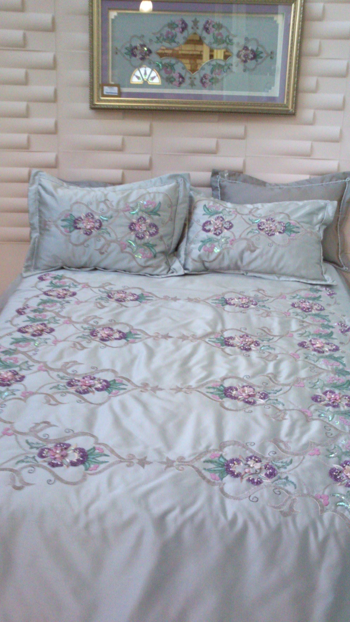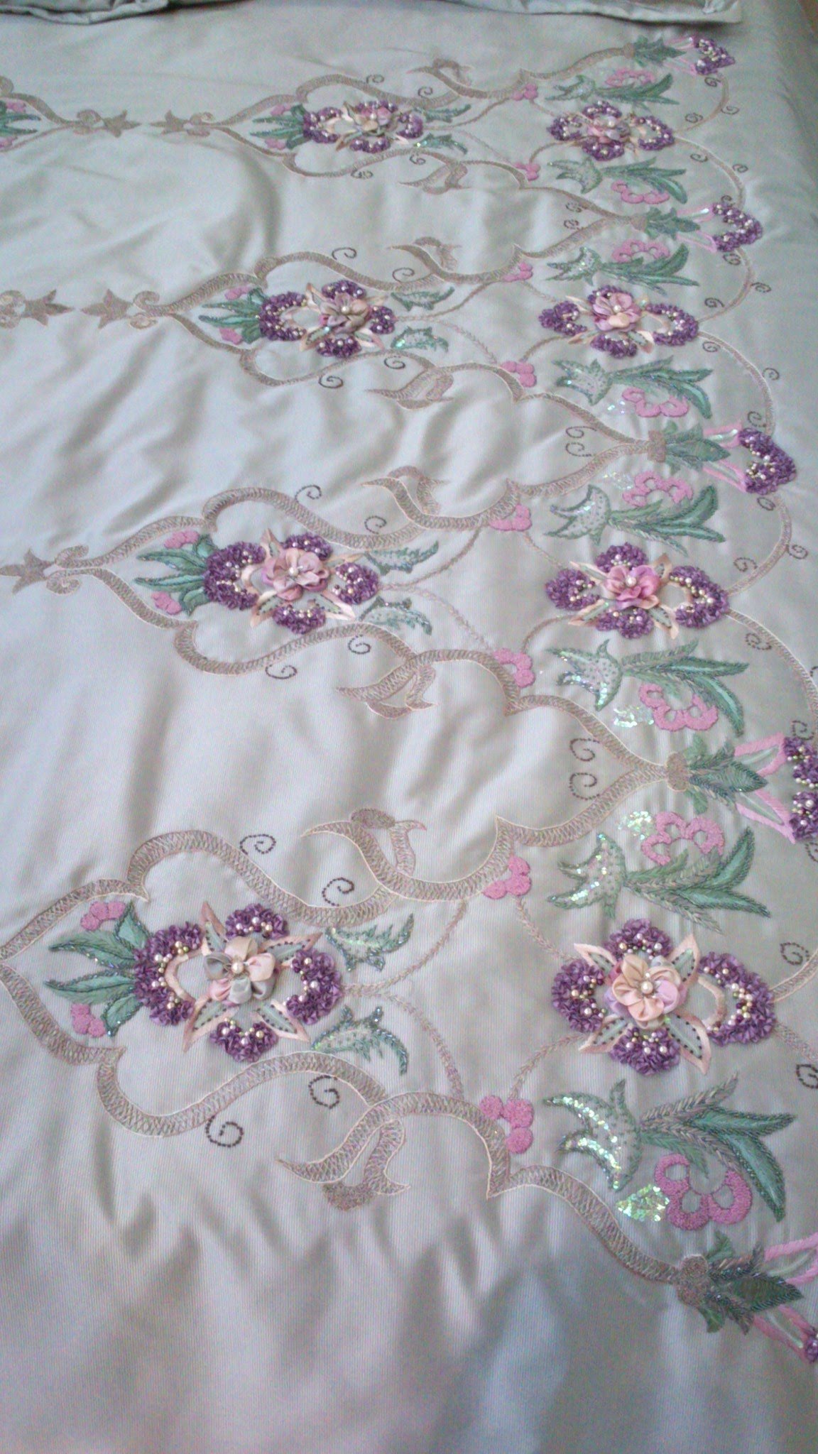Bu kurdele işi yatak örüsünü daha doğrusu yatak odası takımını İSMEK feshane sergisinde çektim. Renkleri ve deseniyle çok güzel ve uyumlu bir takım olmuş. Kurdele nakışı tekninleri ve ipek kurdeleler kullanılarak çalışılmış .