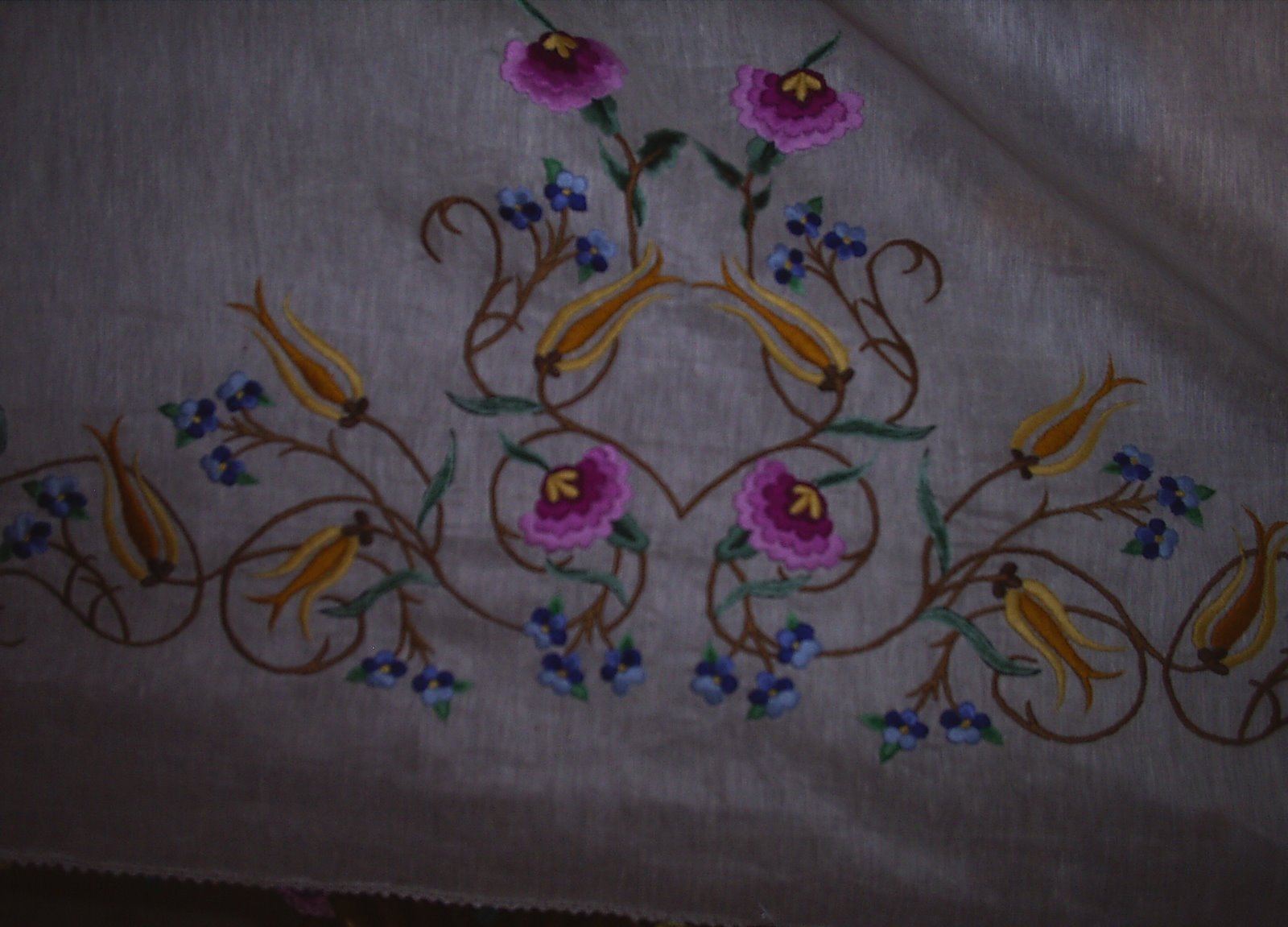 Makina nakışında sarma olarak yapılmış çok şık bir masa örtüsü. Lale ve karanfiller minelerle birleşince ortaya harika bir iş çıkmış.