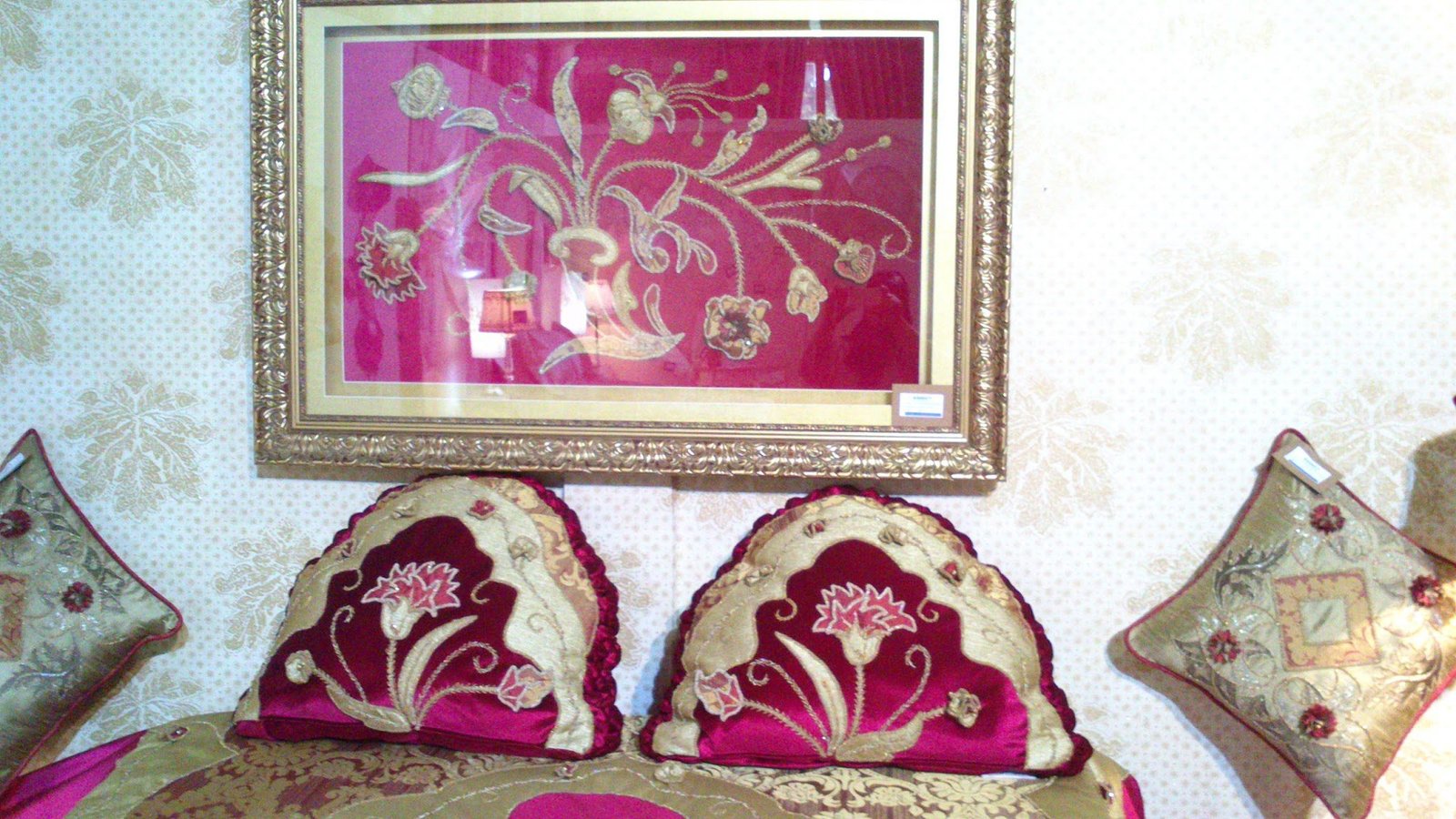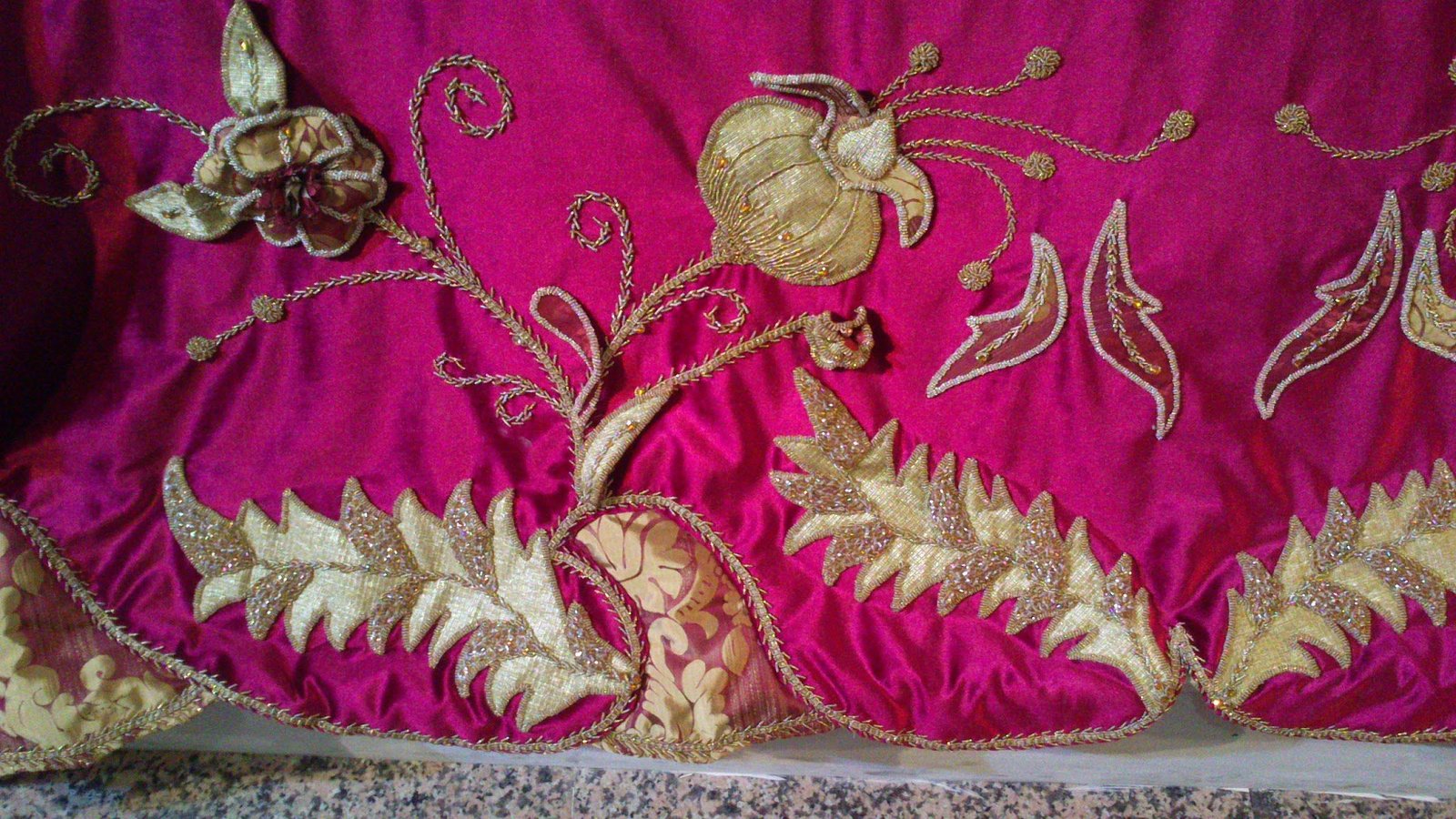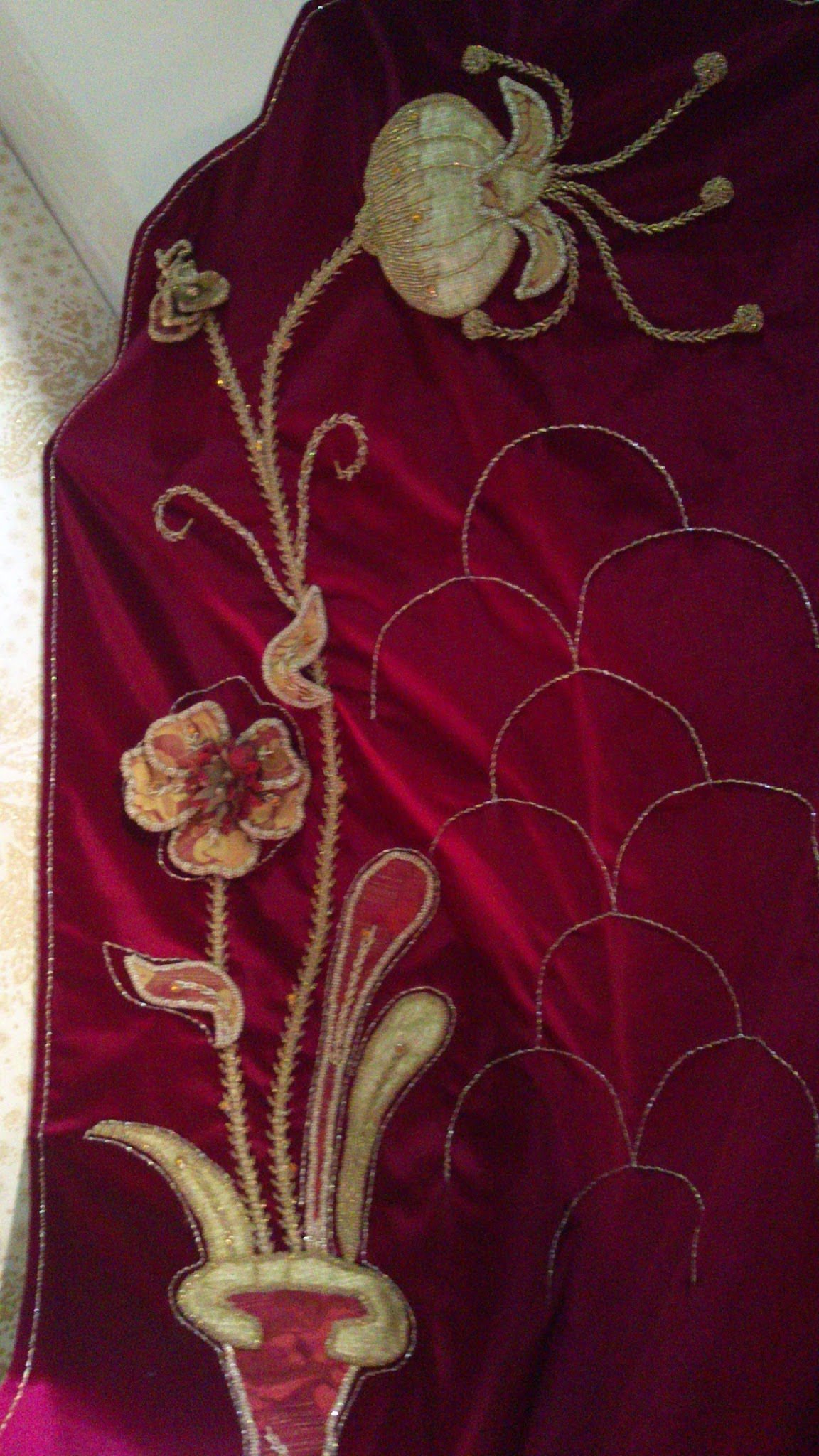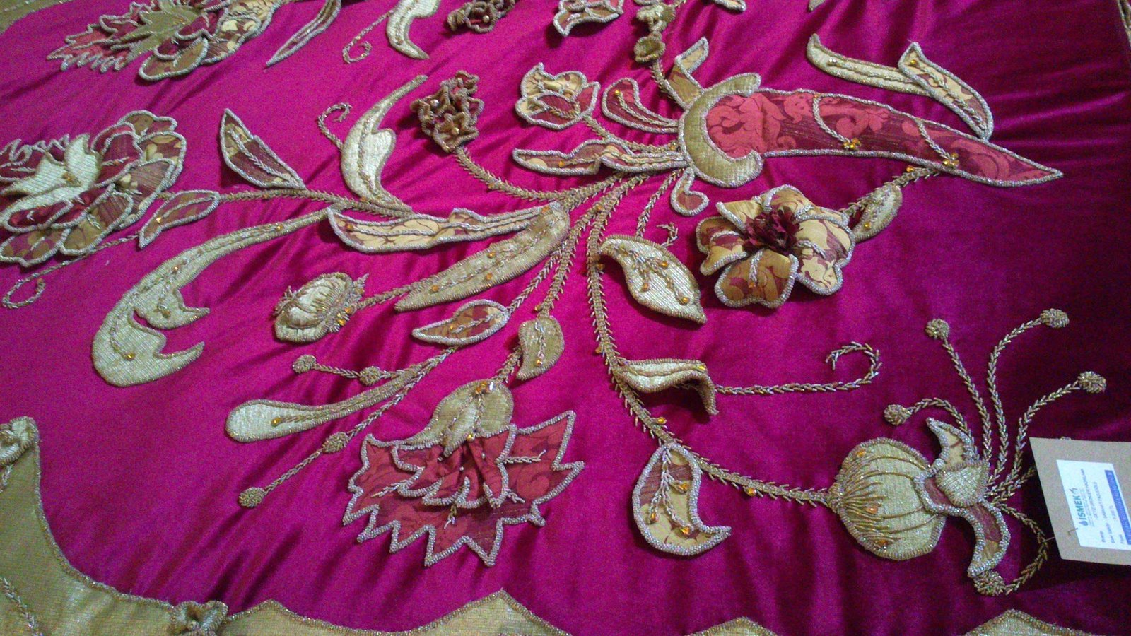Sanırım krallara layık deyimi söylense söylense bu yatak örtüsü için söylenebilir. Aplikenin, üç boyutlu nakışın, boncuk işinin ve farklı el nakışı tekniklerinin birlikte kullanıldığı bu harika yatak örtüsünü İSMEK sergisinde görür görmez vuruldum. Ha benim tarzım mı derseniz, hiç hoşlanmam öyle şatafatlı şeylerden. Ama yapılan çalışma, verilen emek her türlü övgüyü hak ediyor bence. Bu yatak örtüsünün yan çalışmaları da var. Sandığı, abajuru, aynası onları da diğer postta paylaşacağım 🙂